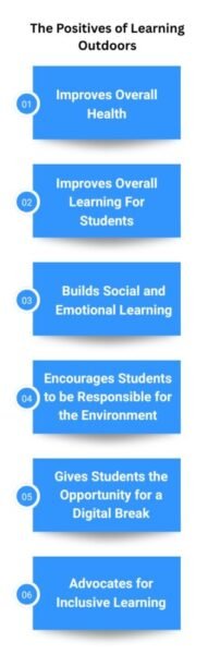 The ability to spend time outside while learning is beneficial for both exercising and getting outside in the fresh air to keep everyone feeling physically and mentally healthy. Their nature can calm and reduce stress while resetting focus letting the students feel more prepared and enthusiastic about learning. For students, outdoor learning helps build skills and encourages students to appreciate and be confident in working with their peers while teaching them about teamwork and leadership, empathy, and fortitude. Above all, outdoor learning helps students build and maintain a connection with nature and the environment while also learning about the importance of protecting the environment.