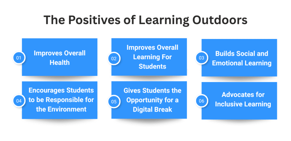 • Gives Students the Opportunity for a Digital Break: Learning outdoor is a helpful way for students to take a break from all their digital learning while being more mindful and involved with their surroundings.